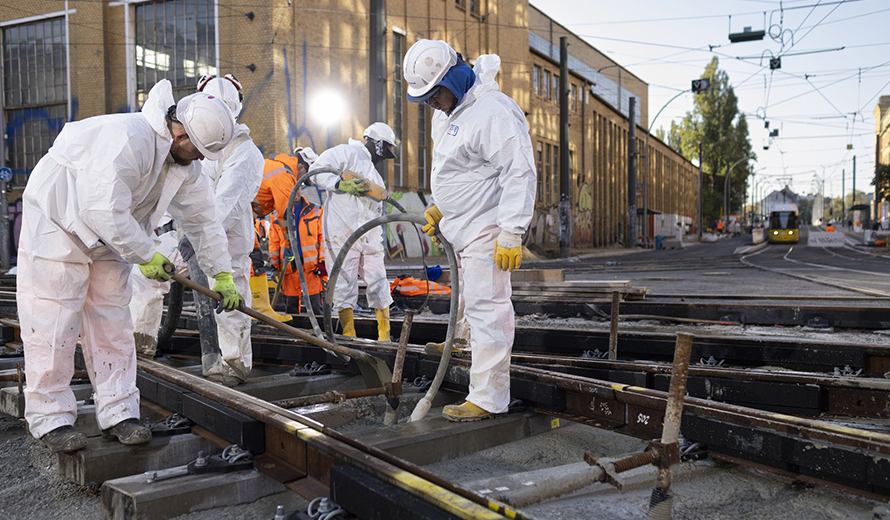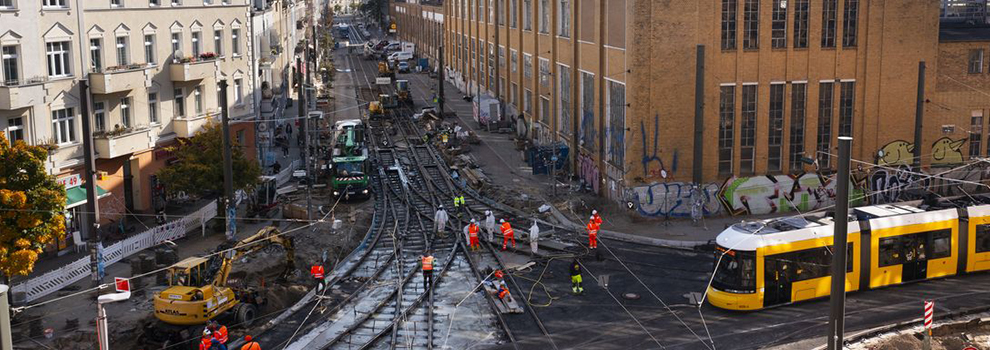 Die Berliner Verkehrsbetriebe (BVG) haben dafür unsere EUROVIA Zweigstelle Berlin und unser Tochterunternehmen Fritze & Co. mit den Bauarbeiten beauftragt. Fritze & Co. war für den Gleisbau, Kabeltiefbau und die Entwässerung verantwortlich, die EUROVIA Zweigstelle Berlin übernahm den Straßen- und Erdbau.