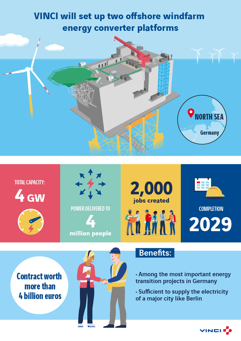 The converter platforms will collect the alternating current generated by several wind farms and convert it into high voltage direct current (HVDC), which will then be reconverted into alternating current at onshore stations approximately 400 km away. The onshore stations are also covered by the contract.