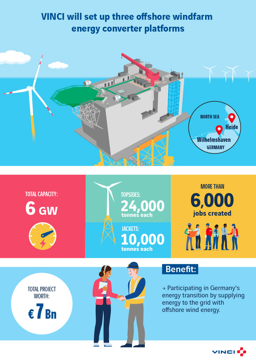 The converter platforms will collect the alternating current generated by several wind farms and convert it into high voltage direct current (HVDC) which will then be reconverted into alternating current at onshore stations approximately 200 km away in the German towns of Wilhelmshaven and Heide.